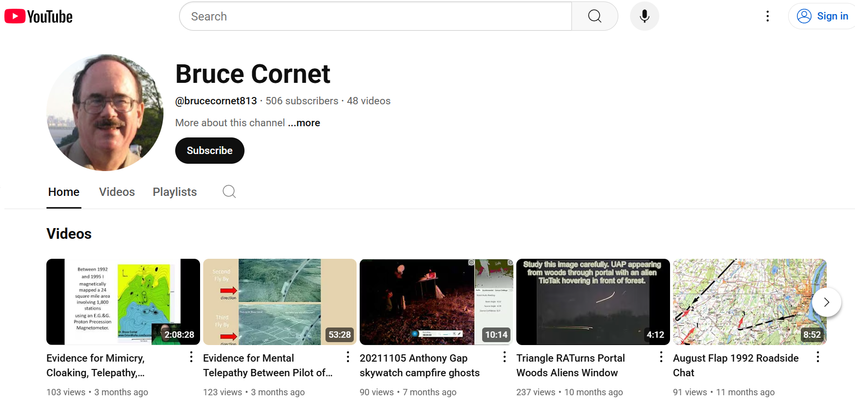 Now retired, Dr Bruce Cornet began his teaching career as a Professor of Physical and Historical Geology with Raritan Community College of New Jersey. Since retiring in 2008, Dr. Cornet has focused his energy on writing, publishing hundreds of web pages describing 140 sightings with pictures and videos, and on ET Contact and Abduction. He has appeared on Coast To Coast Radio, Jimmy Church Fade to Black, and many other radio shows.