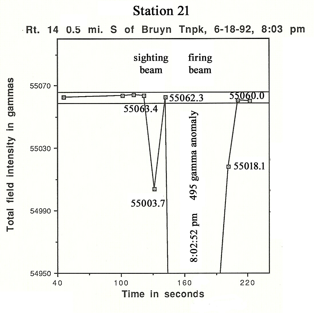 On the night of 18 June 1992 (Bonnie's Birthday; she died on 12 January 1991), the second day after beginning a 24 square mile magnetic survey (three years), along Albany Post Road near Wallkill, NY, Bruce Cornet was shot by a high-powered weapon, hitting him in the lower chest. He was shot by a magnetic railgun. He was taking magnetic readings at the time of the attack using a Precession Proton Magnetometer. The projectile was tiny and magnetic, and lodged in his left kidney. Two weeks later (1 July 1992) he began passing blood. His doctor said he had a bad kidney infection, and gave him strong a antibiotic, which cleared up the infection. On his way home that evening of 28 June 1992, he was met by a UAP at the Harriman Toll Exchange, and followed home. |